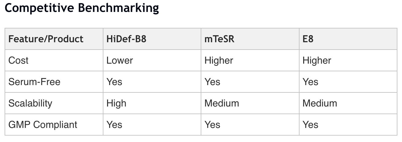 Defined Bioscience’s core differentiation lies in its ability to offer affordable, serum-free, animal-free, and scalable stem cell culture media. While competitors like Thermo Fisher and Stemcell Technologies dominate the large-scale market, Defined Bioscience’s approach targets the growing demand for high-quality, cost-effective reagents in specialized fields, including drug discovery and cultured meat production.