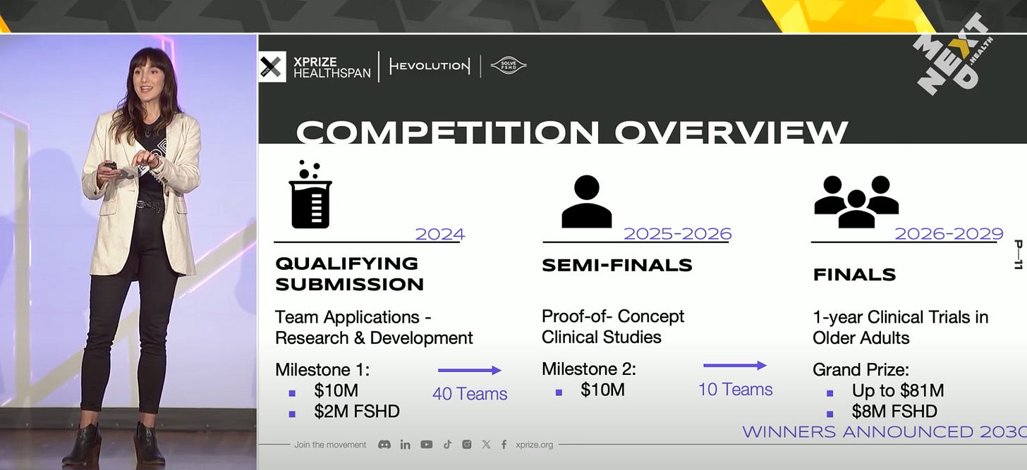 I structured her talk into five major themes: the XPRIZE model, the global aging challenge, the Healthspan Prize, the promise of geroscience, and the future direction of XPRIZE in women’s health.
