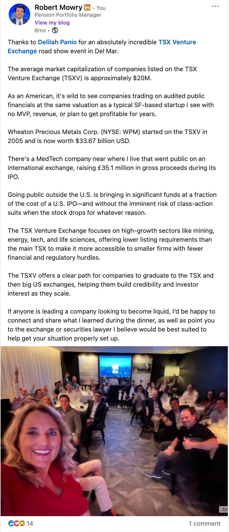 When the Toronto Stock Exchange came to San Diego and hosted an event in Del Mar, I met founders who had: